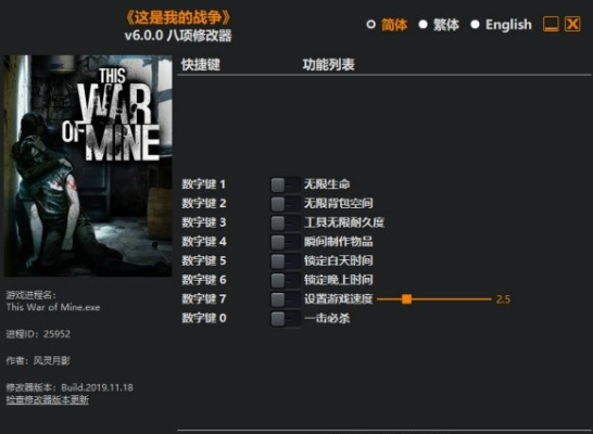 这是我的战争修改器风灵月影版是由风灵月影团队发布的针对《这是我的战争》游戏的辅助工具。修改器设计了简洁直观的用户界面,即便是初次使用的玩家也能快速上手。通过快捷键或者图形界面,玩家可以方便地启用或关闭特定的修改功能,对于已经通关的玩家,修改器可以提供新的玩法,例如增加难度、尝试不同的战斗风格等,从而延长游戏的生命周期。