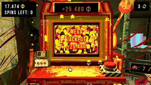 与之对应的,是游戏在摇出大满贯这类排列后,正反馈拉满的特效。随着获胜,整个老虎机都在闪烁,狭小的房间里回荡着金币响动的声音,一轮又一轮奖励叠加的特效,仿佛在放烟火,让生锈老虎机似乎都要被摇爆了。这根本就是赌徒在临死前看到的理想幻觉,真能勾引玩家为了这特效,就一点点继续玩下去。