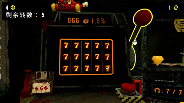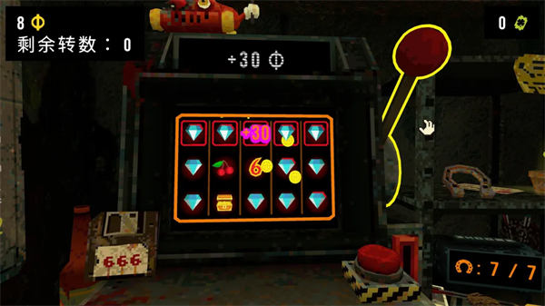 比如,你可以一直疯狂赚钱,可是假如老虎机上不幸出现了三个排在一起的666,也就是代表恶魔的数字,那你的金钱就会全部清零,脚下铁门打开,游戏结束。