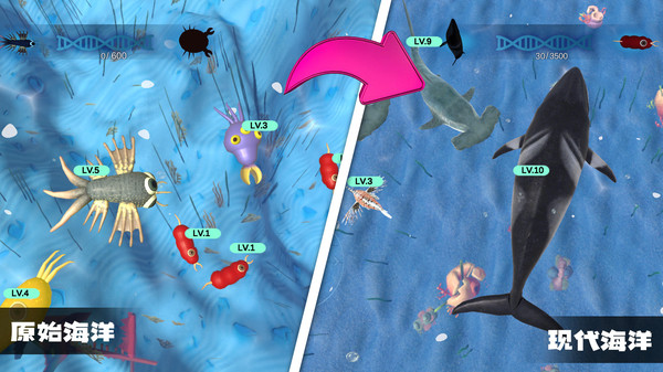 3、每个等级都会改变你的物种类型,不断成长为海洋霸主,占领这片海域。