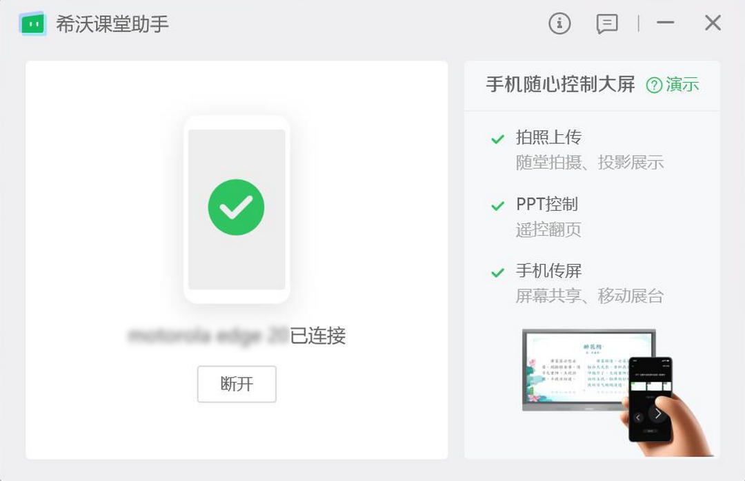 希沃课堂助手是一款在电脑上使用的智能互联教学辅助软件,它是基于无线网络进行研发的,主要是配合手机版的使用,将手机上的PPT、文件等文件投屏到电脑上进行观看。有了希沃课堂助手之后,老师以后再讲课的时候,只要将教学资料放在手机中,然后通过电脑客户端投屏到电脑上就可以使用了,如果教学课件有什么需要修改的地方,在电脑客户端修改也可以同步到手机上面。