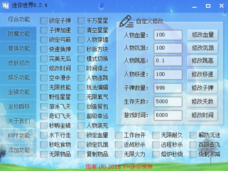 雨寒迷你世界辅助器提供超过 70 种实用功能,涵盖游戏属性修改、图标和背景替换等。例如可锁定子弹、秒吃食物、实现人物穿墙,还能一键生成激活码,帮助玩家获取游戏皮肤和道具。此外,还有附魔功能,支持自定义附魔与一键附魔;也可进行皮肤修改,自定义人物皮肤等。