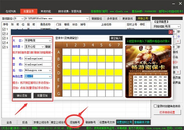 多开与自动登录:支持全功能无限多开,但需谨慎使用,以免被官方封号。具备批量登录、定时上号任务、自动创建角色、自动使用 2888 武圣卡等功能,还能自动上号、掉线重连,可实现 7×24 小时无人值守挂机。