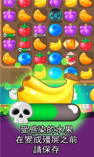 各种熟悉的水果,香蕉、葡萄还有苹果连线成三即可积蓄力量灭掉僵尸。