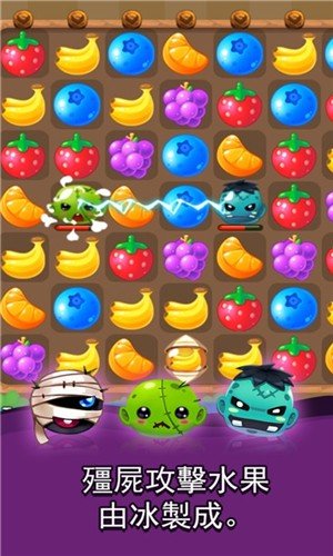 1、各种熟悉的水果,香蕉、葡萄还有苹果连线成三即可积蓄力量灭掉僵尸。