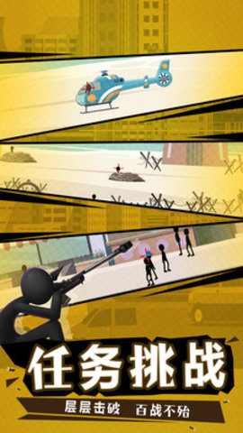 新一代火柴人的狙击战场,3D的画面背景风格设计让场景化也是很客观,多样化的游戏任务挑战难度上也是有的,技术含量也很高哦;