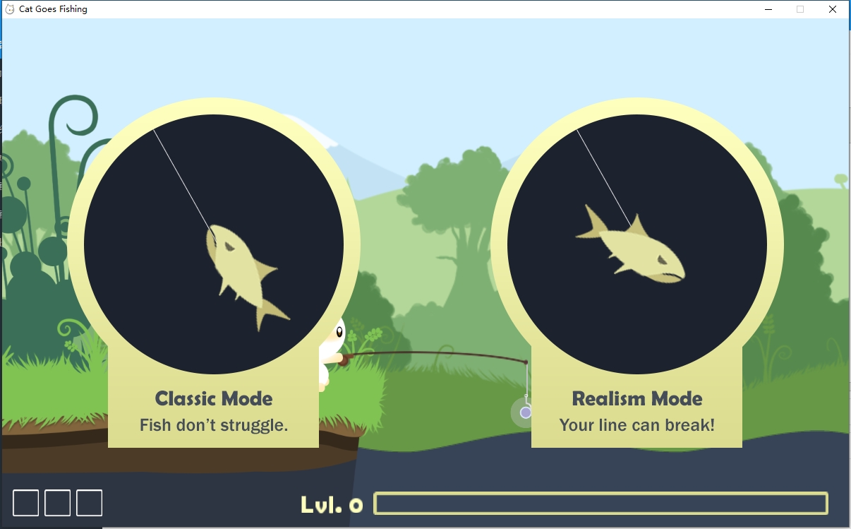 1、初次进入游戏,有两种模式可以选择,一个是经典模式,鱼不会挣扎;另一个是写实模式,你的线可能会断;
