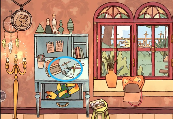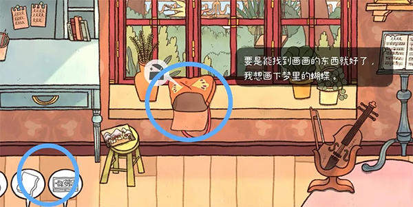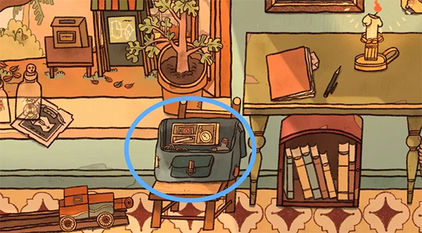22、点击凳子上的蓝色背包,将指南针放入格子中。