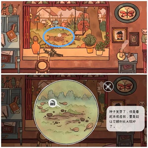 23、来到粉色1909年,打开窗户,点击窗外的土堆,将之前蓝色场景获得的无花果放入。再点击有提示说,种子现在还很虚弱。