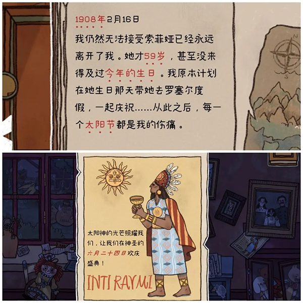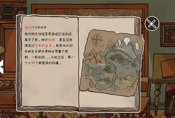 19、出现数字密码锁,根据提示回到1909年,打开衣柜下抽屉里的日记本(根据日记本里的红字提示,大概可知数字密码是索菲亚的出生年月日,日记写下那年是1908,苏菲亚59岁还未来得及过今年的生日,说明1908那年索菲亚应该60岁,可知索菲亚出生是1848年;生日那天是太阳节,根据粉色1910年场景照片框下夹着的是太阳节的海报,日期是6月24日),所以数字密码从内到外圈是482406。