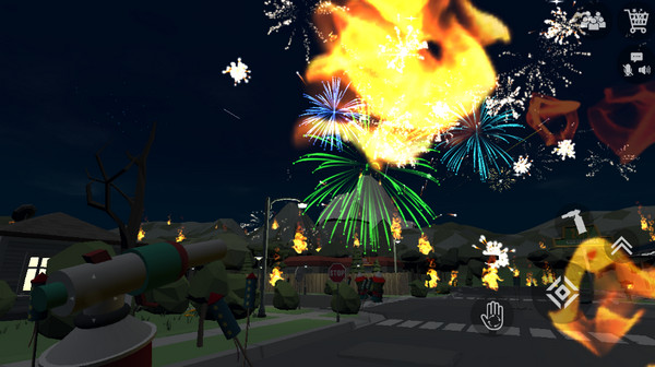 4、进入地图,现在正式开始教大家怎么操作烟花模拟器,屏幕左边是移动,右边的按钮可以捡起烟花、摆放烟花、拿出点火器点火、跳跃,然后就是右上角的烟花商店按钮