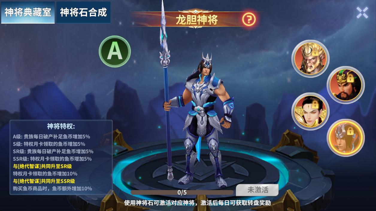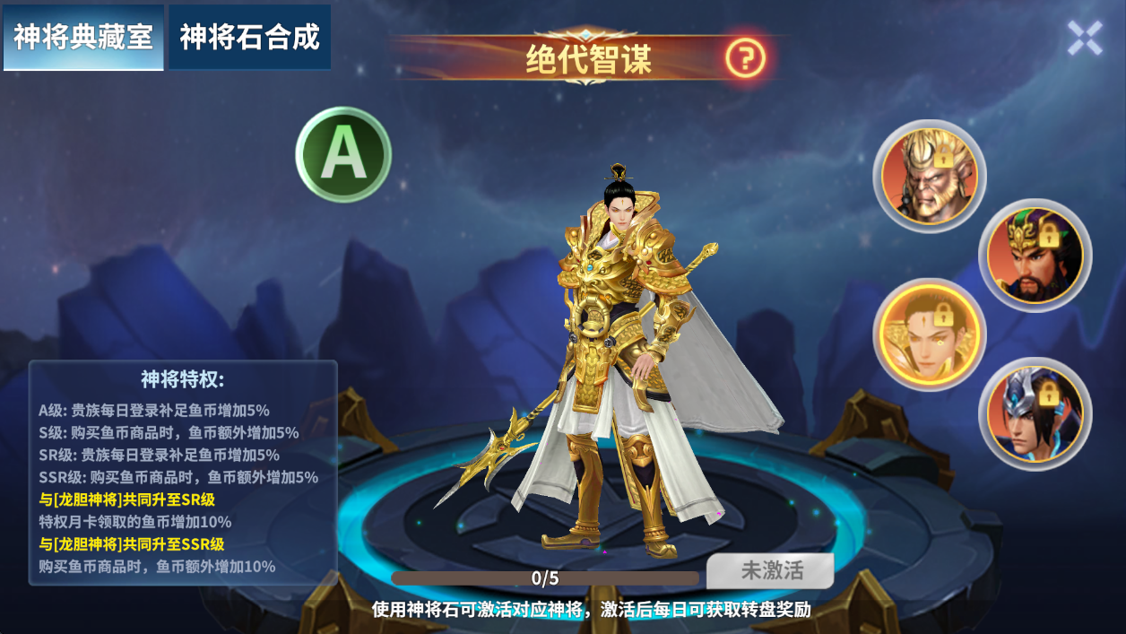 ●神将卡分为A/S/SR/SSR等级,进阶可提升神将等级。