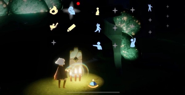 找到蓝色人影并触碰它,跟随光点,我们可以看到一个深灰色的石像,点燃石像上的火苗,它就会教我们一个新的互动姿势。
