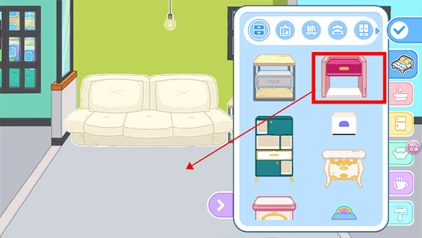 1、首先可以先简单装扮自己的房间,需要用手指拖拽物品往下;