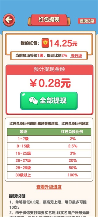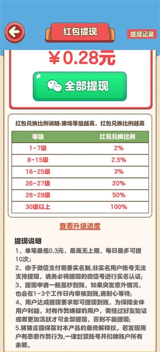 6、所获得的红包以及其他奖励,0.3元可提到微信,猪场等级越高,可提比例越高。