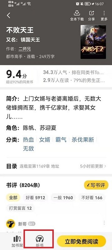 在详情界面中,最下方有个黄色的图标,并有着“听书”字样的按钮,点击即可进入到听书功能之中。