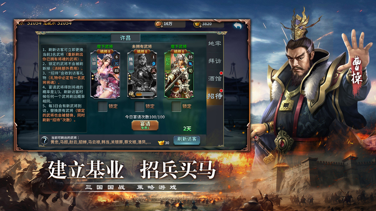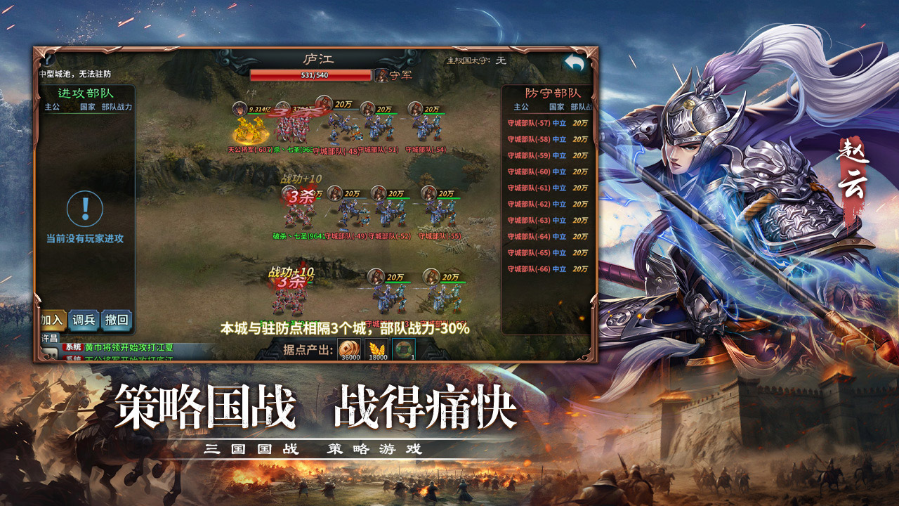 《三国传说》是一款三国题材大型国战策略手游 ,真实还原三国战场,感受经典三国战役,玩家可以招募和培养名将,招兵买马,与他们一起奋勇杀敌,在这里,你可以拥有自己的城池与臣民;在这里,五虎上将、诸葛军师,任你调遣;在这里,大型国战,多人实时互动,天天激情,更有抵御蛮夷、征战世界等热血玩法,带你进入真实的三国世界。
