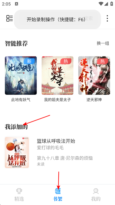 4、点击底部书架标签,可查看我添加的小说列表,也能获取智能推荐的小说,管理已收藏的阅读内容。