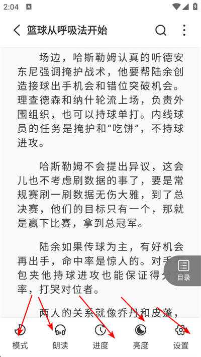 3、进入小说阅读界面,可调整阅读模式朗读进度亮度等设置,也能查看目录,按需切换阅读章节。