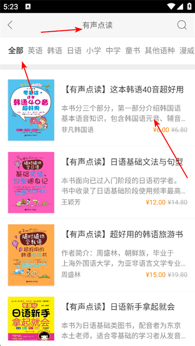 3、进入有声点读专区,可按英语韩语等语种筛选,查看这本韩语40音超好用等书籍,了解书籍介绍和价格信息。