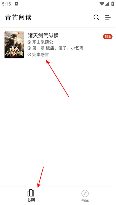 4、返回书架页面,能看到已收藏的诸天剑气纵横等书籍,显示最新章节和更新状态,随时可以继续阅读。