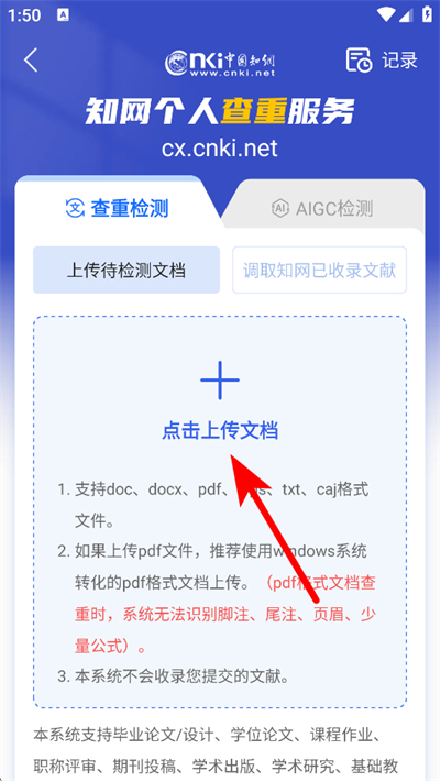 2、在查重页面,点击上传待检测文档,选择要查重的文件。