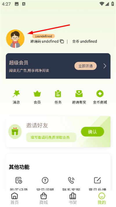2、进入我的个人主页,页面顶部展示用户头像昵称邀请码金币信息,下方设有会员开通入口,还有消息会员任务等各类功能选项。