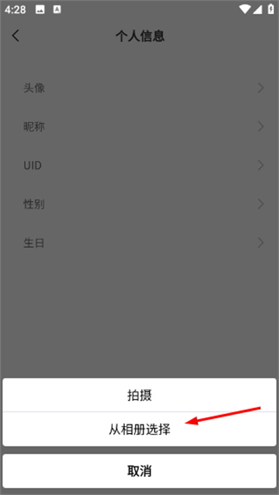 4、点击头像右侧的设置箭头,底部弹出操作选择弹窗,可直接拍摄新头像,也可以从手机相册内挑选图片完成头像更换。