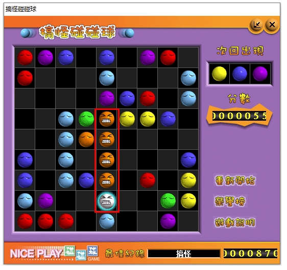 是一款轻松有趣的休闲益智游戏,其玩法简单易上手,同时与传统的五子连珠游戏基本是一模一样的,玩家需要移动小球,将五个或以上颜色相同的小球连成一条直线,无论是直的、横的或是斜的,都可以把球消掉。每移动一次,若无法消掉任何颜色的球时,画面上就会再增加 3 个球。画面会不时出现白色发光的魔法球,它可充当任何颜色的球,帮助玩家尽快连成一线,实现消除。